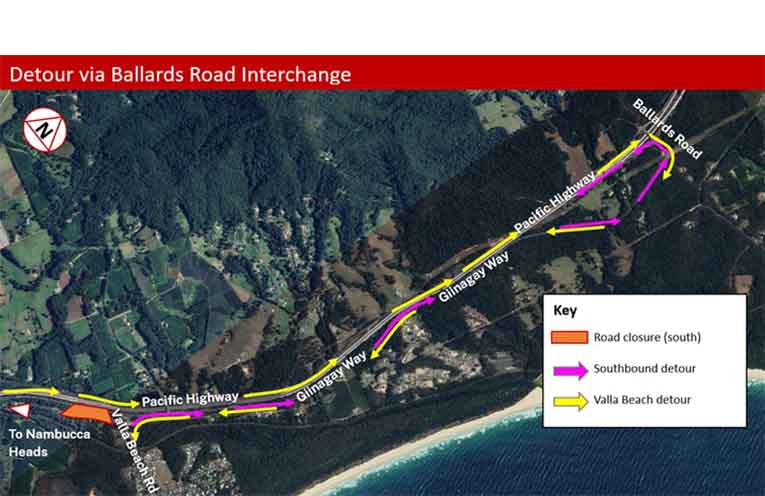 Motorists travelling north on the Pacific Highway must also detour via the Ballards Road interchange to the north of the current Valla Beach Road exit, to access Valla Beach Road from the north.
