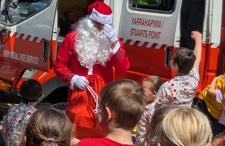 The Yarrahapinni Stuarts Point Rural Fire Service (RFS) performed a very special call-out to deliver Santa, whose helpers had an ample supply of gifts for him to deliver to the excited young ones.